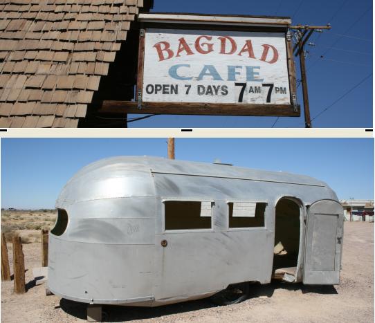 Départ pour Laughlin : 400 km. Une journée de transition. Nous faisons deux étapes, - une à Bagdad Café, "A desert road from Vegas to nowhere" sur la route 66. Les propriétaires ont hélas laissé le lieu à l'abandon. De nombreux cars de touristes (français pour la plupart) s'y arrêtent et les fans se pressent par centaines dans le petit bar ou un couple de vieux américains, incrédules, servent 3 bières et deux cocas. A l'extérieur, le château d'eau a disparu, la caravane de Jack PALANCE est à l'abandon. Quel gâchis ! Courage fuyons ! - du coup l'arrêt à l'outlet Bartsow en plein désert est l'événement de la journée : des dizaines de boutiques vendent à des prix usines les grandes marques. Nous laissons quelques papiers imprimés chez Levis (le 501 était à 20-25 euros) et chez Ralph Lauren. Nous quittons la Californie pour le Nevada. |