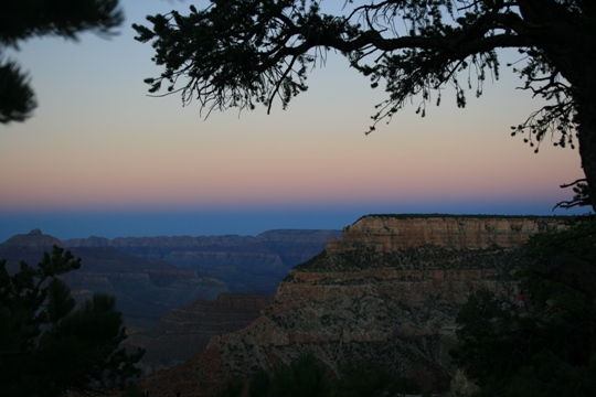 Arrivés à la tombée de la nuit sur la face sud du canyon, nous prenons quelques premiers clichés le long de la route. Grâce à deux petits guides de randonnées, nous choisissons une première balade pour demain, départ 7h30 après le petit dej. L'hôtel sans prétention est très bien avec une petite piscine et une SPA chauffée. Nous y resterons les trois prochaines nuits. |