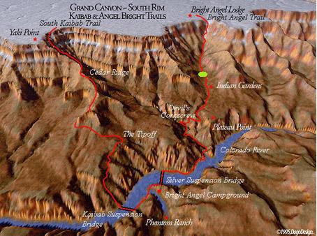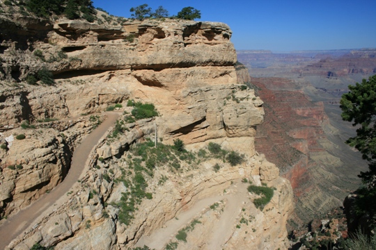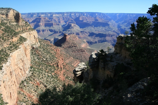 Seconde randonnée dans le canyon, nous sommes deux à descendre le South Kaibab trail (à gauche sur le plan ci-dessus). Il est 9h30 et il fait plus chaud que la veille. Le paysage est différent, le canyon est plus large, le regard porte loin. Nous marchons une heure pour descendre de 400 mètres et faire 5 kilomètres. Sans point d'eau, nous sommes obligés (et satisfaits) de faire demi-tour un peu après Cedar Ridge. La fatigue d'hier se fait sentir. La remontée se fait tranquillement.