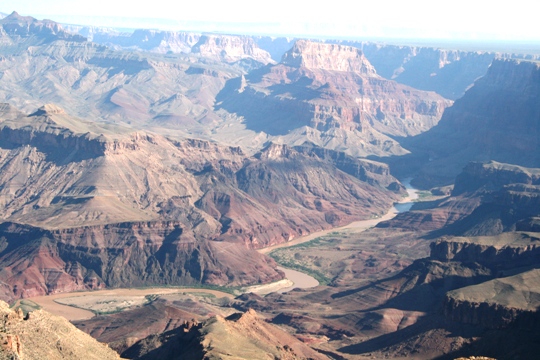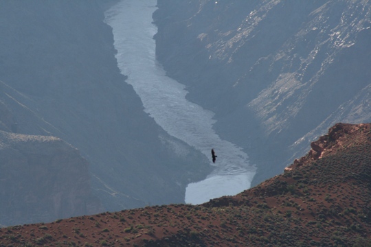Après quelques heures de repos, nous prenons le bus touristique "The red road" qui longe la crête du canyon sur 11 km vers les roches les plus anciennes en aval du Colorado. Au loin, 1400 mètres plus bas, coule la rivière, on aperçoit la fin d'un rapide. Les rapaces insouciants nous font admirer leurs vols concentriques (prise de vue au téléobjectif sans pied !). |