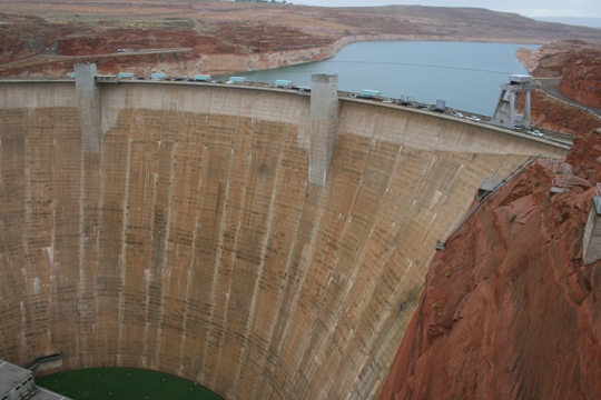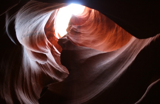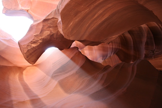 Nous allons à Page (Arizona), sous le Lac Powell alimenté par le Colorado. Sur la route, un arrêt à Antilope Valley nous permet de traverser une faille creusée par les eaux de pluie. La visite commentée par un guide indien est basée sur le jeu de lumière du soleil qui entre par la faille et diffracte. Les ombres font apparaitre des formes : "dame nature is an artist and an architect" says the guide.