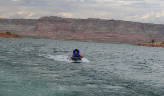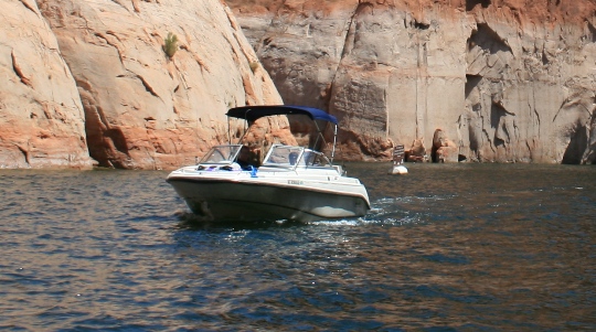 Nous arrivons au lac dès 7h30. Après 15 minutes de présentation des conseils et des consignes de sécurité, nous partons au volant de ce 19' et de son moteur Century 150 cv. Ils sont fous ces américains... Malgré la nouveauté tout se passe bien et nous partons rapidement en espérant remonter assez haut le lac pour atteindre un monument national : le rainbow bridge. Nous entrons alors en bateau dans l'Utah. |