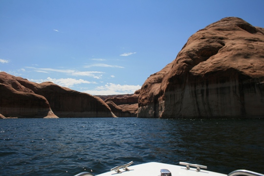Le lac est magnifique, nous naviguons de baie en baie à travers un chenal très large sur le lit du Colorado. Le lac a été créé lors de la construction du barrage au même moment que Serre Ponçon et pour les mêmes raisons : contrôle des inondations, électricité, irrigation et loisirs. La comparaison s'arrête là, celui-ci est beaucoup plus grand à l'échelle de la région. On peut y louer des house boats, mastodontes flottants que l'on conduit dans l'un des innombrables canyons (façon fjord) pour y passer quelques jours avec tout le confort. |