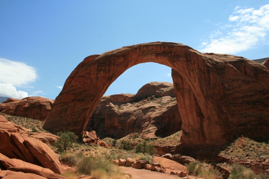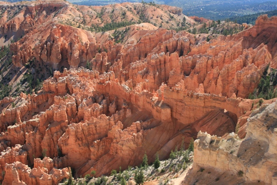 De là, quelques centaines de mètres de marche nous conduisent à ce magnifique pont, produit par l'érosion excentrique de l'eau. Il est haut de 290 mètres. Nous sommes à 100 kilomètres de la première route. Avant le barrage, le pont était à 12 kilomètres de la rivière. Une belle rencontre : le guide rangers de 70 ans est adorable "Voulez-vous visit the rainbow bridge with moi?". Le retour se fait tranquillement, nous essuyons une petite averse mais le soleil revient vite. Nous voici de retour dans l'Arizona. Nous reprenons la route pour 300 kilomètres de liaison à travers des paysages encore une fois très différents : aux déserts de l'Arizona succèdent les forêts de l'Utah dans lequel nous entrons, en voiture cette fois. Ce soir nous couchons aux portes du parc de Bryce Canyon. |