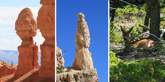 Bryce Canyon : un parc proposant un paysage exceptionnel de roches et une forêt de pins magnifiques. Qu'il est difficile de rendre compte de la beauté de ce parc ! Nous n'y passons que quelques heures, mais le bout de sentier que nous prenons pour descendre dans la roche nous plonge dans un paysage unique. Les roches volcaniques, soulevées il y a plusieurs dizaines de millions d'années, ont connu la mer qui s'est retirée plusieurs fois. L'érosion du vent et de la glace a fait le reste. |