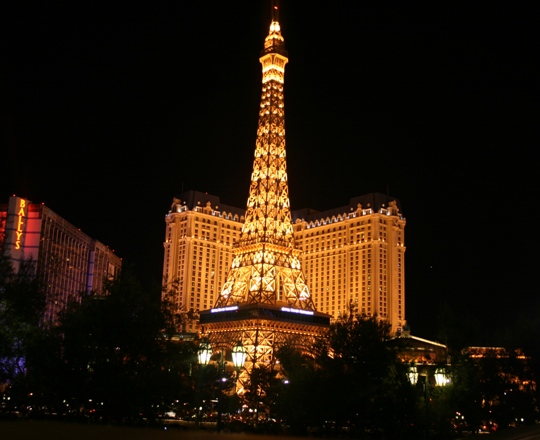 Le soir, nous visitons le PARIS Casino gardé par cette Tour Eiffel que l'on voit dans tous les films sur Las Végas. En fait, le plus étonnant est à l'intérieur : on découvre une belle décoration parisienne . Un ciel artificiel complète le décor de quartier avec ses restaurants (très prisés d'ailleurs) et ses commerces. Malheureusement, aucune photo intérieure n'est réussie, voici donc "leur" Tour Eiffel prise depuis le Bellagio. |