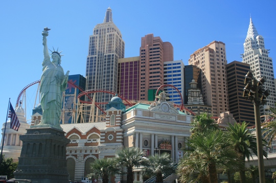 Las Vegas : on n'aime ou on n'aime pas mais c'est quand même incroyable ce qu'ils ont fait ici. Quel gâchis d'eau et d'électricité pour ramener la température de 40° à un 18° dans des volumes immenses. Sur la photo, l'hôtel casino New-York New-York. A l'extérieur, des répliques de la statue de la liberté, du pont de Brooklin et de l'Empire State Building. A l'intérieur, la galerie marchande est décorée dans le style de petites rues new-yorkaises ou l'on achète son hot-dog. Au dessus, une montagne russe en forme de taxis new-yorkais envoie max à 60 mètres de hauteur. Et évidemment, un casino, puisque c'est l'objectif de tout ce miel ! En sortant, nous visitons les magasins de goodies des marques M&Ms et Coca : marrants ! |