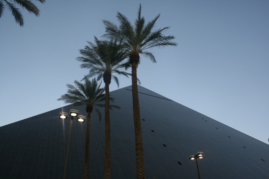 Six heures après, nous rentrons au Nevada. Nous sommes de retour à Vegas dans un nouvel hôtel, le Luxor, où nous nous installons pour trois jours au 16ème étage de la pyramide de verre. L'intérieur est beaucoup moins travaillé que d'autres Casinos mais cette pyramide est impressionnante. Elle est creuse, les chambres sont dans l'épaisseur, tout autour du bâtiment, le casino et les restaurants occupent la base de l'édifice. Il n'y a pas d'ascenseur mais des inclinateurs (comme à la Tour Eiffel, la vraie, l'unique, la nôtre). |