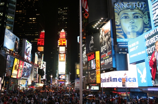 Nous quittons le Nevada pour le New Jersey. Après un vol de 4h30, nous voici à Newark, un des aéroports secondaires de NY. En taxi, nous rejoignons, par le tunnel Lincoln, notre hôtel situé à deux pas de Central Parc et de Broadway, sur la 57ème rue. Une fois installés, la balade du soir nous conduit à pied à Times Square où la foule se masse sous les fameux écrans géants lumineux. Tous les clichés sont là : les gratte-ciel, les flics sortant de l'Italien, les plaques d'égouts qui fument, les vendeurs de hot-dog, les portiers en bas de chaque immeuble, les échelles de secours extérieures, nous sommes bien à New-York ! |