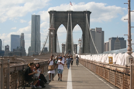 De retour sur la terre ferme, nous passons par "ground zero" pour constater que les travaux sont en cours puis nous traversons le pont de Brooklin. Une belle traversée de 2 km au dessus des voitures... et de l'East river. Le soir nous mangeons chez Bubba Gump à Times Square, chaîne de restaurants inspirés directement du film Forrest Gump et donc spécialisés en crevettes : décor génial, carte sympathique et variée, personnel aux petits oignons. Ils proposent une batida de maracuja à la cachaça Leblond... |