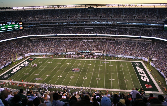 27 Août, nous fêtons les 13 ans de Max ! Nous changeons d'hôtel pour nous installer dans l'Est de Manhattan. Nous faisons une longue promenade dans la ville ensoleillée autour de la 5ème avenue (et dans quelques magasins) avant de rejoindre le nouveau stade flambant neuf des Jets pour leur match contre les Redskins de Washington, c'est du football américain bien sûr. Nous nous y rendons en autocar avec les new-yorkais, l'accueil au stade est génial, le match dure trois heures et les Jets concèdent la défaite sur la fin (16-11). 55 000 personnes assistent à ce match de pré-saison. Nous sommes loin des circuits touristiques, c'est top. |