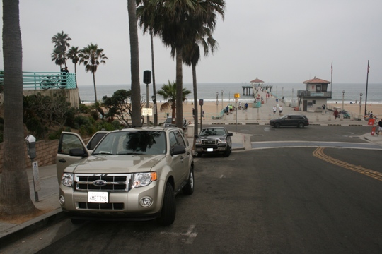 Première balade matinale (décalage horaire oblige) avant que le soleil n'apparaisse (à 11h00) : manhattan beach au sud de la ville. Agréable plage bordée de maisons incroyables. Petit déjeuner anglo-saxon non loin de la plage. Au premier plan :"notre" voiture pour aller jusqu'au désert de la mort en passant par Monument Valley et ses pistes..