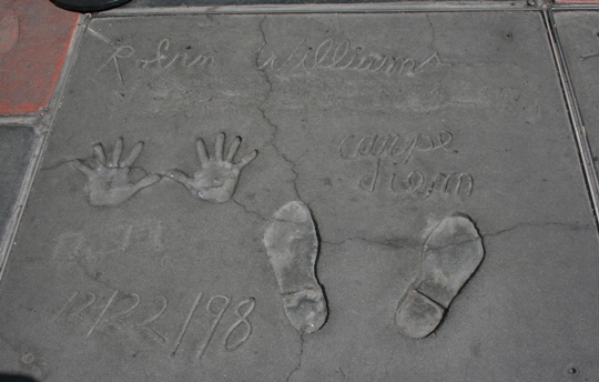 Les moulages (nom+mains +pieds+signature+date) uniquement sur une petite place devant un théâtre. Ici : le cercle des poètes disparus. Il paraît qu'il ressemble à un habitant du sud de la France... C'est plus récent et c'est déjà plein.